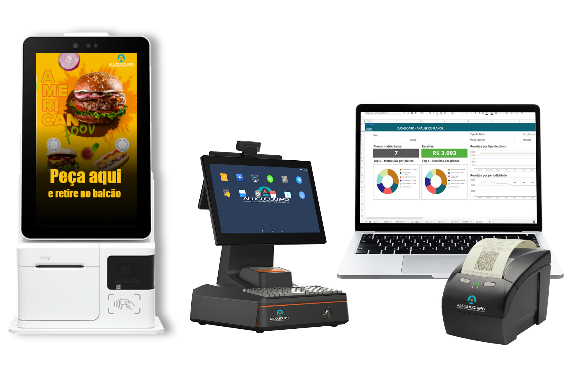 A Aluguequipo oferece locação de equipamentos com economia em compra, manutenção e armazenamento, suporte humanizado via telefone, e-mail e chat, e acesso a um sistema web multusuários na nuvem, com controle personalizado por perfis.